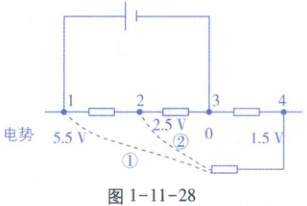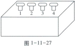 例307 [全国乙2023·20]如图1-11-27所示,黑箱外有编号为1、2、3、4的四个接线柱,接线柱1和2、2和3、3和4之间各接有一个电阻,在接线柱间还接有另外一个电阻R和一个直流电源。测得接线柱之间的电压$U_{12}= 3.0\ V$,$U_{23}= 2.5\ V$,$U_{34}= -1.5\ V$。符合上述测量结果的可能接法是(