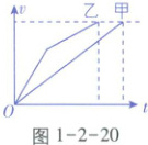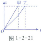 【解析】若 $ a_{1} > a_{3} $,则 $ v - t $ 图像如图 1 - 2 - 20 所示,因为末速度相等,位移相等,即图线与时间轴所围成图形的面积相等,则 $ t_{乙} < t_{甲} $;若 $ a_{3} > a_{1} $,则 $ v - t $ 图像如图 1 - 2 - 21 所示,因为末速度相等,位移相等,即图线与时间轴所围成图形的面积相等,则 $ t_{乙} > t_{甲} $;由上述分析可知,作不出位移相等、速度相等、时间又相等的 $ v - t $ 图线,所以甲、乙两车不可能同时由 $ A $ 点到达 $ C $ 点,故 A、B 正确,C、D 错误.