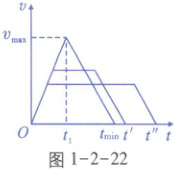【解析】汽车的 $ v - t $ 图线如图 1 - 2 - 22 所示,不同图线与时间轴所围成图形的面积相等,即汽车从甲地到乙地的位移相同,可见中间无匀速过程时,所用时间最短. 设汽车匀加速运动的时间为 $ t_{1} $,最大速度为 $ v_{max} $,则匀减速运动的时间为 $ (t_{min} - t_{1}) $,由 $ v_{max} = a_{1}t_{1} = a_{2}(t_{min} - t_{1}) $,解得 $ t_{1} = \frac{a_{2}t_{min}}{a_{1} + a_{2}} $,则 $ v_{max} = \frac{a_{1}a_{2}t_{min}}{a_{1} + a_{2}} $.