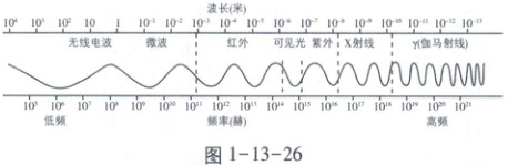 例334 麦克斯韦的电磁场理论指出:变化的电场产生磁场,变化的磁场产生电场,电场和磁场在空间的交替传播就形成了电磁波.从1888年赫兹用实验证实了电磁波的存在.至今,电磁波已经与我们的生活紧密相关.机场安检门使用频率为7 kHz的电磁波,GPS定位系统使用频率为$10.23 MHz(1 MHz = 10^6 Hz)$的电磁波,手机工作时使用频率为800~1 900 MHz的电磁波,无线Wi-Fi使用频率为$2.4 GHz(1 GHz = 10^9 Hz)$的电磁波,地铁行李安检时使用频率为$10^1^8 Hz$的电磁波.根据图1-13-26中给出的电磁波谱和相关信息,下列说法正确的是(