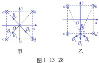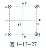 如图1-13-27,四条相互平行的细长直导线垂直坐标系xOy平面,导线与坐标平面的交点为a、b、c、d四点. 已知a、b、c、d为正方形的四个顶点,正方形中心位于坐标原点O,e为cd的中点且在y轴上;四条导线中的电流大小相等,其中过a点的导线的电流方向垂直坐标平面向里,其余导线电流方向垂直坐标平面向外. 则( )