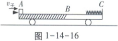 例350 如图1-14-16所示,在光滑的水平轨道上,停放着一辆质量为680g的平板小车,在小车的右端C处的挡板上固定着一根轻质弹簧,在靠近小车左端的车面上A处,放有一块质量为675g的滑块(其形状大小可不计),车面上B处的左侧粗糙而右侧光滑,现有一质量为5g的子弹以一定的初速度水平向右击中滑块,并留在滑块中与滑块一起向右滑动,且在B处相对小车静止,假设子弹与滑块达到共速的时间极短。