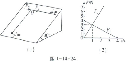 一倾角为 $30^{\circ}$ 足够大的光滑斜面固定于水平地面上,在斜面上建立 $Oxy$ 直角坐标系,如图 1 - 14 - 24(1) 所示。从 $t = 0$ 开始,将一可视为质点的物块从 $O$ 点由静止释放,同时对物块施加沿 $x$ 轴正方向的力 $F_1$ 和 $F_2$,其大小与时间 $t$ 的关系如图 1 - 14 - 24(2) 所示。已知物块的质量为 $1.2\ kg$,重力加速度 $g$ 取 $10\ m/s^2$,不计空气阻力。则(