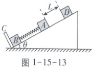 例 376 如图 1 - 15 - 13 所示,在倾角为 $\theta$ 的固定光滑斜面上,有两个用轻质弹簧相连的物块 $A$ 和 $B$,它们的质量均为 $m$,弹簧的劲度系数为 $k$,$C$ 为一固定的挡板,现将一个质量也为 $m$ 的物体 $D$ 从距 $A$ 为 $L$ 的位置由静止释放,$D$ 和 $A$ 相碰后立即粘在一起,之后在斜面上做简谐运动. 在简谐运动过程中,物体 $B$ 对 $C$ 的最小弹力为 $\frac{3}{2}mg\sin\theta$,则以下说法正确的是 (