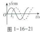 例400 [重庆新高考]某同学为了研究水波的传播特点,在水面上放置波源和浮标,两者的间距为L.$t= 0$时刻,波源开始从平衡位置沿y轴在竖直方向做简谐运动,产生的水波沿水平方向传播(视为简谐波),$t_{1}$时刻传到浮标处使浮标开始振动,此时波源刚好位于正向最大位移处,波源和浮标的振动图像分别如图1-16-21中的实线和虚线所示,则(