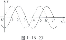 【解析】根据图1-16-23可知波长$\lambda = 4\ m$,根据平衡位置在$x = 6\ m处的质点在0到0.1\ s时间内运动方向不变可知,波传播的距离小于半个波长,所以波沿x轴负方向传播,周期T = \frac{0.1}{n + \frac{1}{2}}\ s$,当$n = 0时,T = 0.2\ s$,波速$v = \frac{\lambda}{T} = 20\ m/s$;当$n = 1时,T = \frac{1}{15}\ s$,波速$v = 60\ m/s等,但题目中0到0.1\ s时间内平衡位置在x = 6\ m处的质点运动方向不变,所以只能是n = 0$,周期$T = 0.2\ s$,波速$v = 20\ m/s$,传播方向沿$x$轴负方向.