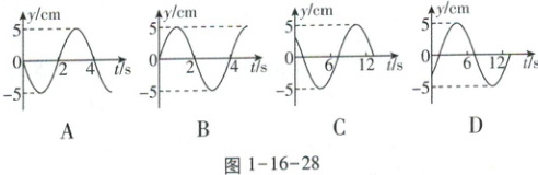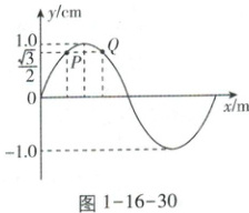 【解析】由图1-16-29乙可知$2\ s = \frac{5}{6}T$,$T = \frac{12}{5}\ s = 2.4\ s$,频率为$f = \frac{5}{12}\ Hz$,B正确$;由题意,$在图1-16-29甲中标出位移为$\frac{\sqrt{3}}{2}\ cm的质点P$、$Q$,$如图1-16-30$