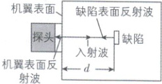 例410[江西$2024\cdot6]$如图1-16-36(a)所示,利用超声波可以检测飞机机翼内部缺陷.在某次检测实验中,入射波为连续的正弦信号,探头先后探测到机翼表面和缺陷表面的反射信号,分别如图1-16-36(b)(c)所示.已知超声波在机翼材料中的波速为6300\ m/s.关于这两个反射信号在探头处的叠加效果和缺陷深度d,下列选项正确的是 (