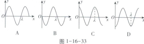 )【解析$】x = \frac{5}{4}\lambda$处质点的振动图像如图1-16-34所示$,t = \frac{3}{4}T时刻,x = \frac{5}{4}\lambda$处质点的位移y = 0,质点处于平衡位置且向上运动,由于波沿x轴负方向传播,可知符合要求的波形图为D.