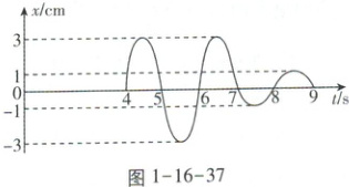 [浙江2024年6月·11]频率相同的简谐波源$S_1、$$S_2$和接收点M位于同一平面内$,S_1、$$S_2$到M的距离之差为6m。t= 0时$,S_1、$$S_2$同时垂直平面开始振动,M点的振动图像如图1-16-37所示,则( )