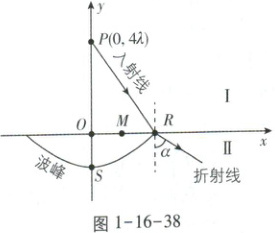 [浙江2024年1月·15]在如图1-16-38所示的直角坐标系中,xOz平面为介质Ⅰ和Ⅱ的分界面(z轴垂直纸面向外,图中未画出)。在介质Ⅰ中的P(0,4λ)处有一点波源,产生波长为λ、速度为v的波。波传到介质Ⅱ中,其速度为√2v,图示时刻介质Ⅱ中仅有一个波峰,与x轴和y轴分别交于R和S点,此时波源也恰好位于波峰。M为O、R连线的中点,入射波与反射波在O点相干加强,则(