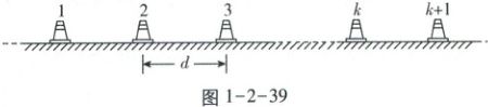 例41 [广西2024·13]如图1-2-39,轮滑训练场沿直线等间距摆放着若干个定位锥筒,锥筒间距$d = 0.9$ m,某同学穿着轮滑鞋向右匀减速滑行。现测出他从$1号锥筒运动到2号锥筒用时t_1 = 0.4$ s,从$2号锥筒运动到3号锥筒用时t_2 = 0.5$ s。求该同学