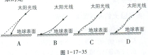 地球表面附近空气的折射率随高度降低而增大,太阳光斜射向地面的过程中会发生弯曲。下列光路图(图1-17-35)中能描述该现象的是(