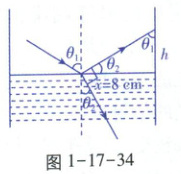 【解析】根据几何关系画出光路图,如图1-17-34所示,标注入射角 $ \theta_1 $、折射角 $ \theta_2 $,根据折射定律可得 $ n = \frac{\sin \theta_1}{\sin \theta_2} = \frac{x}{h} = \frac{8 cm}{h} $,代入选项中的数据可知,B正确。