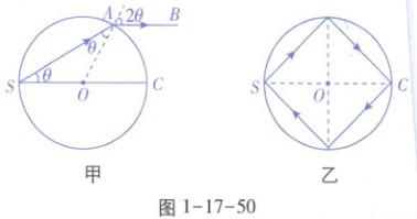 一个水平放置的圆柱形罐体内装了一半的透明液体,液体上方是空气,其截面如图1-17-45所示。一激光器从罐体底部 $ P $ 点沿着罐体的内壁向上移动,它所发出的光束始终指向圆心 $ O $ 点。当光束与竖直方向成 $ 45° $ 角时,恰好观察不到从液体表面射向空气的折射光束。已知光在空气中的传播速度为 $ c $,求液体的折射率 $ n $ 和激光在液体中的传播速度 $ v $。
