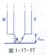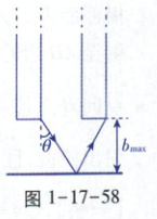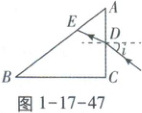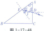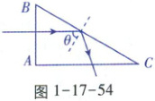 ② 由题意知,甲光恰好发生了全反射,光路图如图1-17-54所示,设全反射的临界角为 $ \theta $,由全反射公式可知 $ \sin \theta = \frac{1}{n_1} = k_1 $,由几何关系可知 $ \angle ABC = \theta $,$ \sin \theta = \sin \angle ABC = \frac{l_{AC}}{l_{BC}} $,解得 $ l_{BC} = \frac{l_{AC}}{\sin \theta} = \frac{l}{k_1} $。