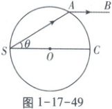 如图1-17-49,一个半径为 $ R $ 的玻璃球,$ O $ 点为球心。球面内侧单色点光源 $ S $ 发出的一束光在 $ A $ 点射出,出射光线 $ AB $ 与球直径 $ SC $ 平行,$ \theta = 30° $。光在真空中的传播速度为 $ c $。求: