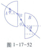 (ii) 当 $ \theta = 30° $ 时,有光线沿 $ B $ 的半径射出,光路如图1-17-52所示,由光的折射定律,有 $ n = \frac{\sin \alpha}{\sin \theta} $,由几何知识得 $ h = d \tan \alpha + R \sin \theta $,解得 $ d = \sqrt{2} \left( h - \frac{R}{2} \right) $。