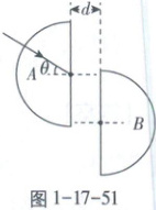 将两块半径均为 $ R $、完全相同的透明半圆柱体 $ A $、$ B $ 正对放置,圆心上下错开一定距离,如图1-17-51所示。用一束单色光沿半径照射半圆柱体 $ A $,设圆心处入射角为 $ \theta $。当 $ \theta = 60° $ 时,$ A $ 右侧恰好无光线射出;当 $ \theta = 30° $ 时,有光线沿 $ B $ 的半径射出,射出位置与 $ A $ 的圆心相比下移 $ h $。不考虑多次反射。求:
