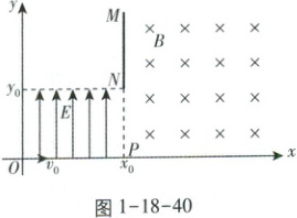 例 456 [海南 2023·13]如图 1 - 18 - 40 所示,质量为 $ m $、带电荷量为 $ +q $ 的带电粒子,从坐标原点 $ O $ 以初速度 $ v_0 $ 射入第一象限内的电、磁场区域,在 $ 0 < y < y_0 $、$ 0 < x < x_0 $($ x_0 $、$ y_0 $ 为已知量)区域内有竖直向上的匀强电场,在 $ x > x_0 $ 区域内有垂直纸面向里、大小为 $ B $ 的匀强磁场,控制电场强度 $ E $($ E $ 值有多种可能),可让粒子从 $ NP $ 射入磁场后偏转打到足够长的接收器 $ MN $ 上,不计重力,则(