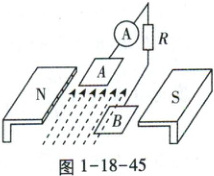 例 460 如图 1 - 18 - 45 所示为磁流体发电机的原理图,将一束等离子体(带有等量正、负电荷的高速粒子流)喷射入磁场,在磁场中有两块金属板 $ A $、$ B $,这时金属板上就会聚集电荷,产生电压。如果射入的等离子体速度为 $ v $,两金属板间距离为 $ d $,板的面积为 $ S $,匀强磁场的磁感应强度为 $ B $,方向与速度方向垂直,负载电阻为 $ R $。当发电机稳定发电时电动势为 $ E $,电流为 $ I $,则下列说法正确的是(