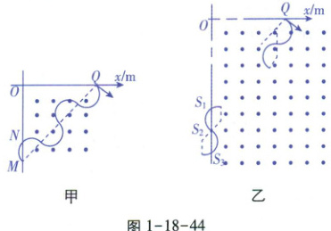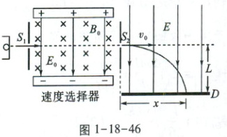 例 461 如图 1 - 18 - 46 所示的装置,左半部分为速度选择器,右半部分为匀强偏转电场。一束同位素离子流从狭缝 $ S_1 $ 射入速度选择器,能够沿直线通过速度选择器并从狭缝 $ S_2 $ 射出的离子,又沿着与电场垂直的方向,立即进入场强大小为 $ E $ 的偏转电场,最后打在照相底片 $ D $ 上。已知同位素离子的电荷量为 $ q(q > 0) $,速度选择器内部存在着相互垂直的场强大小为 $ E_0 $ 的匀强电场和磁感应强度大小为 $ B_0 $ 的匀强磁场,照相底片 $ D $ 与狭缝 $ S_1 $、$ S_2 $ 的连线平行且距离为 $ L $,忽略重力的影响。