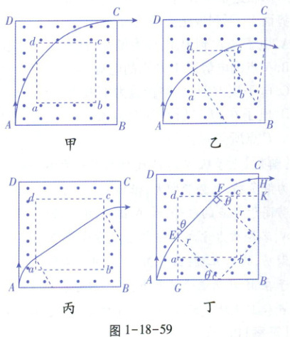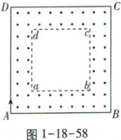例$468$[河北$2024\cdot10$]如图$1-18-58$,真空区域有同心正方形$ABCD和abcd$,其各对应边平行,$ABCD$的边长一定,$abcd$的边长可调,两正方形之间充满恒定匀强磁场,方向垂直于正方形所在平面.$A$处有一个粒子源,可逐个发射速度不等、比荷相等的粒子,粒子沿$AD$方向进入磁场.