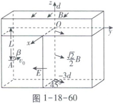 例$469$[山东新高考]中国“人造太阳”在核聚变实验方面取得新突破,该装置中用电磁场约束和加速高能离子,其部分电磁场简化模型如图$1-18-60$所示,在三维坐标系$Oxyz$中,$0<z\leq d$空间内充满匀强磁场Ⅰ,磁感应强度大小为$B$,方向沿$x$轴正方向;$-3d\leq z<0$,$y\geq0$的空间内充满匀强磁场Ⅱ,磁感应强度大小为$\frac{\sqrt{2}}{2}B$,方向平行于$xOy$平面,与$x轴正方向夹角为45°$;$z<0$,$y\leq0的空间内充满沿y$轴负方向的匀强电场.质量为$m$、带电荷量为$+q$的离子甲,从$yOz平面第三象限内y轴为L的点A$以一定速度出射,速度方向与$z轴正方向夹角为\beta$,在$yOz$平面内运动一段时间后,经坐标原点$O沿z$轴正方向进入磁场Ⅰ.不计离子重力.