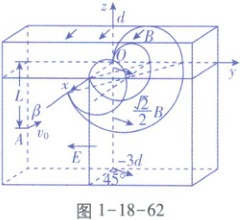 $v_1= \frac{mv_1}{qB}= \frac{d}{2}$,如图$1-18-61(b)$所示,离子甲在磁场Ⅰ中偏转半个圆周到达$y轴上y_1= 2r_1= d$处,然后垂直于$xOy平面进入z<0$区域,在磁场Ⅱ中做匀速圆周运动(运动平面与磁场Ⅱ中磁感应强度方向垂直),偏转半个圆周后到达$x$轴,从$x= x_1处垂直于xOy平面进入z>0$区域,离子甲在磁场Ⅱ中做匀速圆周运动的轨迹半径$r_2= \frac{mv_1}{\frac{\sqrt{2}}{2}Bq}= \frac{\sqrt{2}}{2}Bq\frac{d}{2}$,由几何关系及对称性可知$x_1= d$,之后离子甲在$y'x'z'平面内偏转半个圆周后第四次穿过xOy$平面,可知离子甲的$x轴坐标为d$,$y轴坐标为d$,$z轴坐标为0$,故所求坐标为$(d,d,0)$.