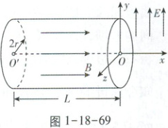例$474$[湖南$2024\cdot14$]如图$1-18-69$,有一内半径为$2r$、长为$L$的圆筒,左右端面圆心$O'$、$O$处各开有一小孔.以$O$为坐标原点,取$O'O方向为x轴正方向建立xyz$坐标系.在筒内$x\leq0$区域有一匀强磁场,磁感应强度大小为$B$,方向沿$x$轴正方向;筒外$x\geq0$区域有一匀强电场,场强大小为$E$,方向沿$y$轴正方向.一电子枪在$O'$处向圆筒内多个方向发射电子,电子初速度大小均在$xOy$平面内,且在$x轴正方向的分速度大小均为v_0$.已知电子的质量为$m$、电量为$e$,设电子始终未与筒壁碰撞,不计电子之间的相互作用及电子的重力.