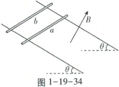 例 494 [湖南 2023·14]如图 1-19-34,两根足够长的光滑金属直导轨平行放置,导轨间距为 $ L $,两导轨及其所构成的平面均与水平面成 $ \theta $ 角,整个装置处于垂直于导轨平面斜向上的匀强磁场中,磁感应强度大小为 $ B $。现将质量均为 $ m $ 的金属棒 $ a $、$ b $ 垂直导轨放置,每根金属棒接入导轨之间的电阻均为 $ R $。运动过程中金属棒与导轨始终垂直且接触良好,金属棒始终未滑出导轨,导轨电阻忽略不计,重力加速度为 $ g $。