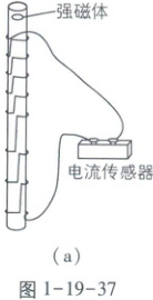 【解析】由楞次定律可知,漆包线绕成的线圈对小磁体的下落有阻碍作用,且金属铝管对小磁体的下落也有阻碍作用,则小磁体通过金属铝管的实验中,阻碍作用更明显,下落速度整体小于在玻璃管中的,故在铝管中下落时漆包线中产生的感应电流对应小于在玻璃管中的,故题图1-19-37(c)是用玻璃管获得的图像,A正确;小磁体在铝管中运动,受到铝管中电流的阻碍作用和线圈中电流的阻碍作用,小磁体下落速度越大,受到的阻碍作用越大,所以小磁体做变加速运动,B错误;在玻璃管中下落时,设漆包线绕成的线圈阻碍小磁体运动的力为f,随着小磁体向下运动,速度增大,f增大,C错误;由A项分析可知,小磁体在金属铝管中运动的平均速度要小于在玻璃管中的平均速度,由s = $\overline{v}$t可知,两者运动位移s相等,小磁体在玻璃管中运动的时间更短,D错误。