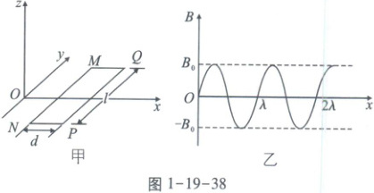 例499 磁悬浮列车是一种高速低耗的新型交通工具。它的驱动系统简化为如下模型:固定在列车下端的动力绕组可视为一个矩形纯电阻金属框,电阻为R,金属框置于xOy平面内,长边MN长为l,平行于y轴,宽为d的NP边平行于x轴,如图1-19-38甲所示。列车轨道沿Ox方向,轨道区域内存在垂直于金属框平面的磁场,磁感应强度B沿Ox方向按正弦规律分布,其空间周期为λ,最大值为B₀,如图1-19-38乙所示,金属框同一长边上各处的磁感应强度相同,整个磁场以速度v₀沿Ox方向匀速平移。设在短暂时间内,MN、PQ边所在位置的磁感应强度随时间的变化可以忽略,并忽略一切阻力。列车在驱动系统作用下沿Ox方向加速行驶,某时刻速度为v(v < v₀)。