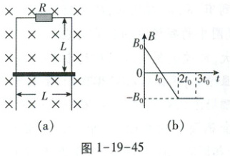 [辽宁新高考]如图1-19-45(a)所示,两根间距为L、足够长的光滑平行金属导轨竖直放置并固定,顶端接有阻值为R的电阻。垂直导轨平面存在变化规律如图1-19-45(b)所示的匀强磁场,$ t = 0 $时磁场方向垂直纸面向里。在$ t = 0 到 t = 2t_0 $的时间内,金属棒水平固定在距导轨顶端L处;$ t = 2t_0 $时,释放金属棒。整个过程中金属棒与导轨接触良好,导轨与金属棒的电阻不计,则(