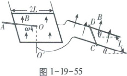 [河北2024·14]如图1-19-55,边长为$2L$的正方形金属细框固定放置在绝缘水平面上,细框中心$O处固定一竖直细导体轴OO'$。间距为$L$、与水平面成$\theta$角的平行导轨通过导线分别与细框及导体轴相连。导轨和细框分别处在与各自所在平面垂直的匀强磁场中,磁感应强度大小均为$B$。足够长的细导体棒$OA在水平面内绕O点以角速度\omega$匀速转动,水平放置在导轨上的导体棒$CD$始终静止。$OA$棒在转动过程中,$CD$棒在所受安培力达到最大和最小时均恰好能静止。已知$CD棒在导轨间的电阻值为R$,电路中其余部分的电阻均不计,$CD$棒始终与导轨垂直,各部分始终接触良好,不计空气阻力,重力加速度大小为$g$。