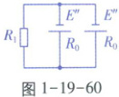 (2)金属框进入磁场过程,由于金属框的上、下边框处处与导轨始终接触良好,所以金属框的上、下边框被短路,作出等效电路如图1-19-59所示,设金属框速度大小为$v_1$,根据法拉第电磁感应定律有$E' = BLv_1$,感应电流$I'= \frac{E'}{R_0+\frac{2}{3}R_0}= \frac{3E'}{5R_0}$,设金属框完全进入磁场时速度大小为$v_2$,由动量定理可得$-\sum BI'L\cdot\Delta t = mv_2 - mv_0$,又$\sum v_1\cdot\Delta t = L$,可得$v_2= \frac{2B^2L^3}{5mR_0}$,由能量守恒定律可得,此过程中电路中产生的总热量$Q_{总1}= \frac{1}{2}mv_0^2 - \frac{1}{2}mv_2^2$,由并联电路电流规律和$Q = I^2Rt$可知,$R_1上产生的热量Q_1= \frac{2}{15}Q_{总1}= \frac{7B^4L^6}{125mR_0^2}$,金属框完全进入磁场后到右边框运动到磁场右边界时,等效电路如图1-19-60所示,通过$R_1的电流I_1= \frac{E''}{2R_0+\frac{1}{2}R_0}= \frac{2E''}{5R_0}$,即流过左右边框的电流之和为$\frac{2E''}{5R_0}$,设金属框右边框刚要出磁场时速度大小为$v_3$,由动量定理可得$-\sum BI_1L\cdot\Delta t = mv_3 - mv_2$,可得$v_3 = 0$,金属框将停止运动。由能量守恒定律可得,此过程中电路中产生的总热量$Q_{总2}= \frac{1}{2}mv_2^2 - \frac{1}{2}mv_3^2$,$R_1上产生的热量Q_2= \frac{4}{5}Q_{总2}= \frac{8B^4L^6}{125mR_0^2}$,在金属框整个运动过程中,电阻$R_1产生的热量为Q_{R1}= Q_1 + Q_2= \frac{3B^4L^6}{25mR_0^2}$。