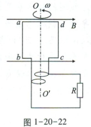 例525 一个电阻为$r$、边长为$L的正方形线圈abcd共N$匝,线圈在磁感应强度大小为$B的匀强磁场中绕垂直于磁感线的轴OO'$以如图1-20-22所示的角速度$\omega$匀速转动,外电路电阻为$R$.