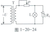 例528 如图1-20-24所示,理想变压器T的原线圈接在电压为U的交流电源两端,P为滑动变阻器的滑片,$R_{T}$为热敏电阻,其阻值随温度升高而减小,则(