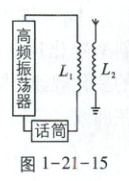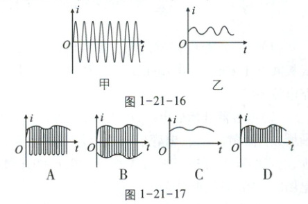 例 548 实际发射无线电波如图 1 - 21 - 15 所示,高频振荡器产生高频等幅振荡如图 1 - 21 - 16 甲所示,人对着话筒说话产生低频振荡如图 1 - 21 - 16 乙所示。根据这两个图像,发射出去的电磁波图像应是图 1 - 21 - 17 中的(