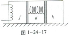 例581 [全国新课标2023·21]如图1-24-17,一封闭着理想气体的绝热汽缸置于水平地面上,用轻弹簧连接的两绝热活塞将汽缸分为f、g、h三部分,活塞与汽缸壁间没有摩擦。初始时弹簧处于原长,三部分中气体的温度、体积、压强均相等。现通过电阻丝对f中的气体缓慢加热,停止加热并达到稳定后(