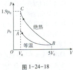 例582 [广东2023·13]在驻波声场作用下,水中小气泡周围液体的压强会发生周期性变化,使小气泡周期性膨胀和收缩。气泡内气体可视为质量不变的理想气体,其膨胀和收缩过程可简化为如图1-24-18所示的p-V图像,气泡内气体先从压强为$p_{0}$、体积为$V_{0}$、温度为$T_{0}$的状态A等温膨胀到体积为$5V_{0}$、压强为$p_{B}$的状态B,然后从状态B绝热收缩到体积为$V_{0}$、压强为$1.9p_{0}$、温度为$T_{C}$的状态C,B到C过程中外界对气体做功为W。已知$p_{0}$、$V_{0}$、$T_{0}$和W。求: