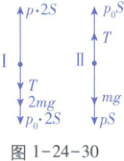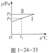 例597 [重庆新高考]某同学探究一封闭汽缸内理想气体的状态变化特性,得到压强$p随温度t$的变化如图1-24-33所示. 已知图线Ⅰ描述的是体积为$V_{1}$的等容过程,当温度为$t_{1}时气体的压强为p_{1}$;图线Ⅱ描述的是压强为$p_{2}$的等压过程. 取$0^{\circ}C为273K$,求:
