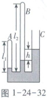 例595 [全国高考]如图1-24-32,一玻璃装置放在水平桌面上,竖直玻璃管$A$、$B$、$C$粗细均匀,$A$、$B$两管的上端封闭,$C$管上端开口,三管的下端在同一水平面内且相互连通. $A$、$B两管的长度分别为l_{1} = 13.5cm$,$l_{2} = 32cm$. 将水银从$C$管缓慢注入,直至$B$、$C两管内水银柱的高度差h = 5cm$. 已知外界大气压为$p_{0} = 75cmHg$. 求$A$、$B$两管内水银柱的高度差.