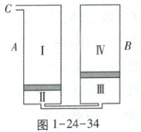 【解析】以$B$中气体为研究对象,设初状态压强为$p_{B}$,体积为$V_{B}$,$B管横截面积为S$,初状态$p_{B} = p_{0}$,$V_{B} = l_{2}S$,设末状态压强为$p'_{B}$,体积为$V'_{B}$,$p'_{B} = p_{0} + p_{h} = 75cmHg + 5cmHg = 80cmHg$,$V'_{B} = l'_{2}S$,由于水银从$C$管缓慢注入,整个过程管内气体发生等温变化,由玻意耳定律得$p_{B}V_{B} = p'_{B}V'_{B}$,解得$l'_{2} = 30cm$;以$A$中气体为研究对象,设初状态压强为$p_{A}$,体积为$V_{A}$,$A管横截面积为S'$,初状态$p_{A} = p_{0}$,$V_{A} = l_{1}S'$,设末状态压强为$p'_{A}$,体积为$V'_{A} = l'_{1}S'$,由图1-24-32中液柱关系可得$A中水银柱高为l_{1} - l'_{1}$,$C中水银柱高为h + (l_{2} - l'_{2}) = 7cm$,则$A中气体末状态压强p'_{A} = (l'_{1} + 68.5)cmHg$,整个过程管内气体发生等温变化,由玻意耳定律有$p_{A}V_{A} = p'_{A}V'_{A}$,解得$l'_{1} = 12.5cm$,设$A$、$B两管内水银柱的高度差为\Delta h$,则$\Delta h = (l_{2} - l'_{2}) - (l_{1} - l'_{1}) = 1cm$.