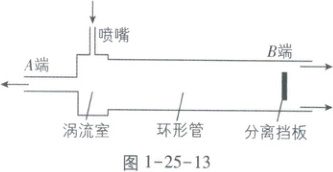 利用“涡流效应”可实现冷热气体的分离。如图1-25-13,一冷热气体分离装置由喷嘴、涡流室、环形管、分离挡板和冷热两端管等构成。高压氮气由喷嘴切向流入涡流室中,然后以螺旋方式在环形管中向右旋转前进,分子热运动速率较小的气体分子将聚集到环形管中心部位,而分子热运动速率较大的气体分子将聚集到环形管边缘部位。气流到达分离挡板处时,中心部位气流与分离挡板碰撞后反向,从$A$端流出,边缘部位气流从$B$端流出。下列说法正确的是(