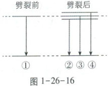 例 633 [辽宁 2023·6]原子处于磁场中,某些能级会发生劈裂。某种原子能级劈裂前后的部分能级图如图 1 - 26 - 16 所示,相应能级跃迁放出的光子分别设为①②③④。若用①照射某金属表面时能发生光电效应,且逸出光电子的最大初动能为 $ E_{k} $,则(