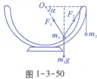 【解析】质量为 $m_{1}$ 的小球受重力 $m_{1}g$、线的拉力 $F_{2} = m_{2}g$ 和半球形碗的支持力 $F_{1}$ 的作用而平衡,如图1 - 3 - 50所示. 由几何关系知 $F_{1}$ 与 $F_{2}$ 分别在一个正三角形的两个边上,所以 $F_{1}$ 与 $F_{2}$ 之间的夹角为 $60^{\circ}$. 由共点力平衡的条件得,$F_{1}$ 与 $F_{2}$ 的合力 $F$ 与 $m_{1}g$ 大小相等、方向相反,则由几何关系可知,$F$ 位于 $F_{1}$ 与 $F_{2}$ 的角平分线上,故 $F_{1} = F_{2}$,以 $F_{1}$ 与 $F_{2}$ 为邻边所作平行四边形为菱形,$F_{1}$ 与 $F_{2}$ 的合力 $F = 2F_{2}\cos 30^{\circ} = \sqrt{3}m_{2}g$,又因为 $F = m_{1}g$,所以 $\frac{m_{2}}{m_{1}} = \frac{\sqrt{3}}{3}$. 故选项A正确.