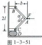 例61 如图1 - 3 - 51是某压榨机的原理示意图,$B$ 为固定支架,$A$ 为活动铰链,在 $A$ 处作用一水平力 $F$,滑块 $C$ 就以比 $F$ 大得多的力压物体 $D$,已知图中 $l = 0.5\ m$,$b = 0.05\ m$,$F = 200\ N$,$C$ 与左壁接触面光滑,求 $D$ 受到的压力的大小(滑块和杆的重力不计).