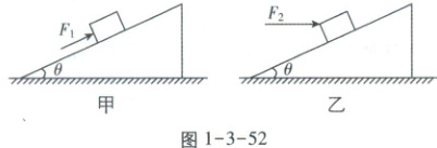 例62 如图1 - 3 - 52所示,一物体置于倾角为 $\theta$ 的固定斜面上,物体与斜面之间的动摩擦因数为 $\mu$. 先用平行于斜面的推力 $F_{1}$ 作用于物体,恰好能使该物体沿斜面匀速上滑(如图1 - 3 - 52甲所示). 若改用水平推力 $F_{2}$ 作用于该物体上,也恰好能使该物体沿斜面匀速上滑(如图1 - 3 - 52乙所示). 则两次的推力之比 $\frac{F_{1}}{F_{2}}$ 为( )