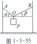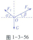 【解析】光滑挂钩两侧的绳为同一根绳,它们的拉力大小相等,均为F_T,以结点为研究对象,其受力如图1-3-56所示.则F_Tcosα - F_Tcosβ = 0,F_Tsinα +
